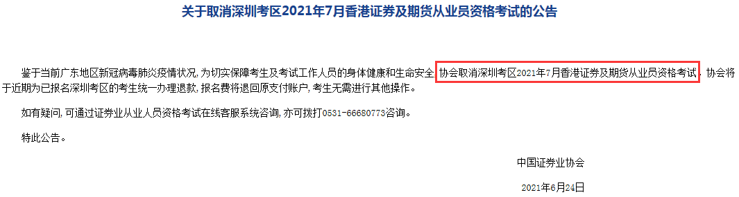 鑒于當(dāng)前廣東地區(qū)新冠病毒肺炎疫情狀況,為切實(shí)保障考生及考試工作人員的身體健康和生命安全,協(xié)會(huì)取消深圳考區(qū)2021年7月香港證券及期貨從業(yè)員資格考試。協(xié)會(huì)將于近期為已報(bào)名深圳考區(qū)的考生統(tǒng)一辦理退款,報(bào)名費(fèi)將退回原支付賬戶,考生無(wú)需進(jìn)行其他操作。