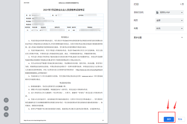 在證券考試準考證打印入口開通時,很多考生查詢準考證信息所用的設(shè)備,并沒有連接打印機設(shè)備。為方便隨時打印,考生可選擇先將準考證下載成PDF版,等找到打印設(shè)備時就不用再登錄中國證券業(yè)協(xié)會官網(wǎng)進行打印了,可直接使用PDF文檔進行證券準考證的打印。