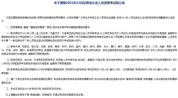 為落實(shí)國家新冠疫情防控政策,按照各地疫情防控具體要求,為切實(shí)保障廣大考生及考試工作人員的生命健康,現(xiàn)將2021年12月證券業(yè)從業(yè)資格考試有關(guān)調(diào)整情況公告如下: