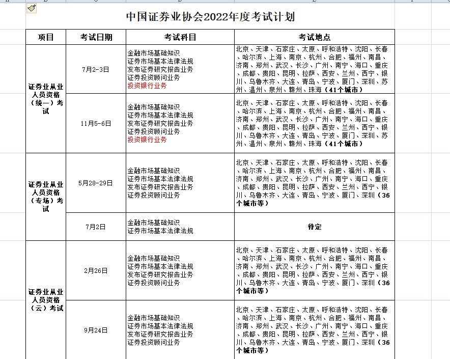 三、證券業(yè)從業(yè)人員資格(云)考試擬舉辦2次,面向證券公司報(bào)考,全國(guó)36個(gè)城市舉辦。